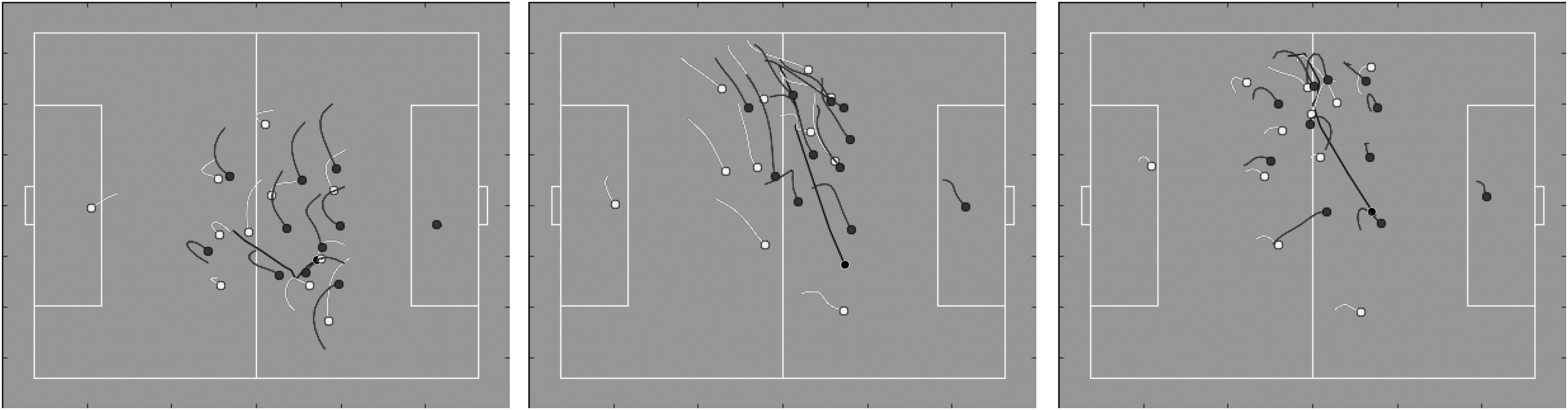 High-valued scenes (Fig. 5) typically involved open passing options on the wing or fast, dynamic attacks where multiple players moved toward goal.