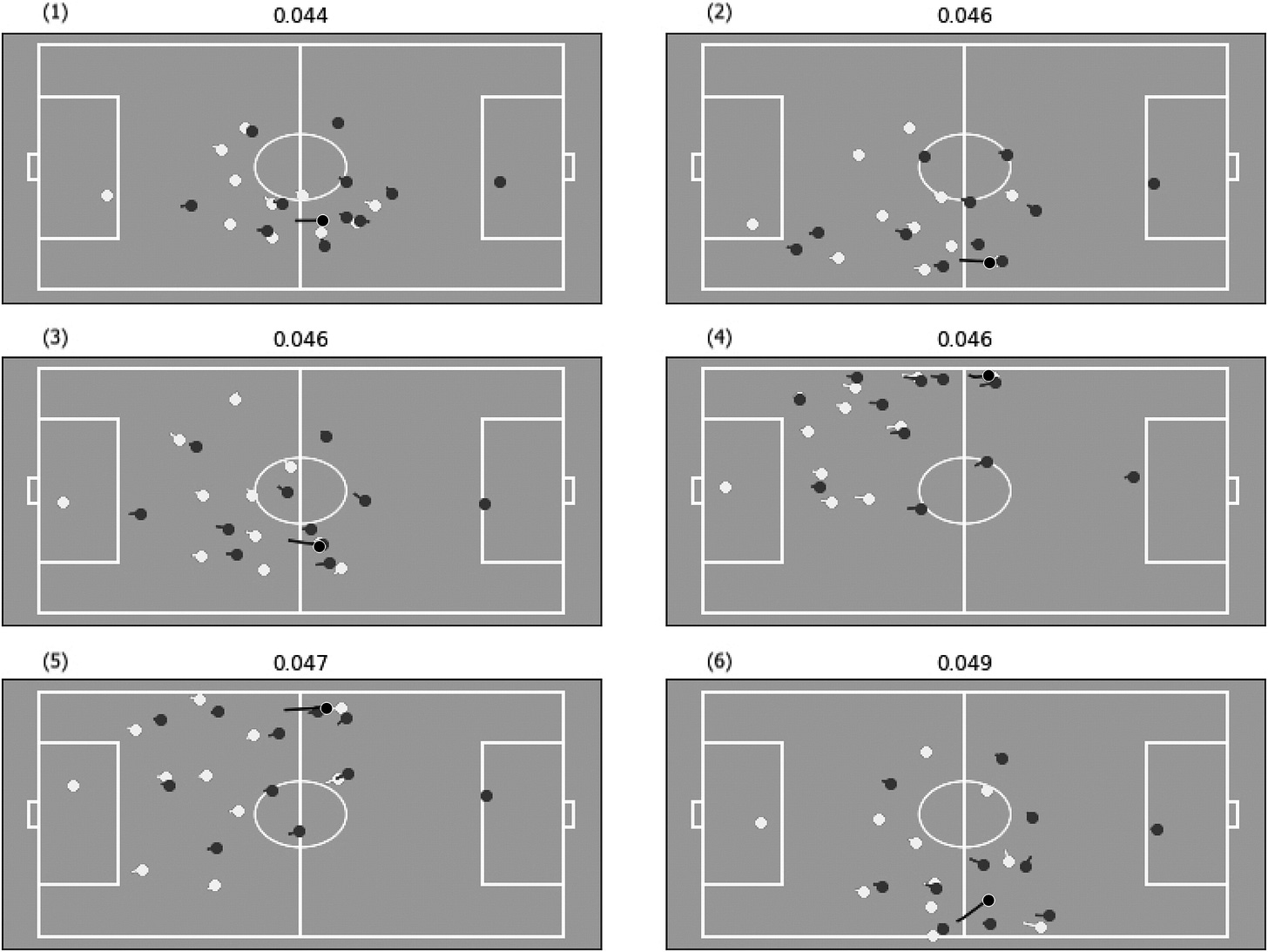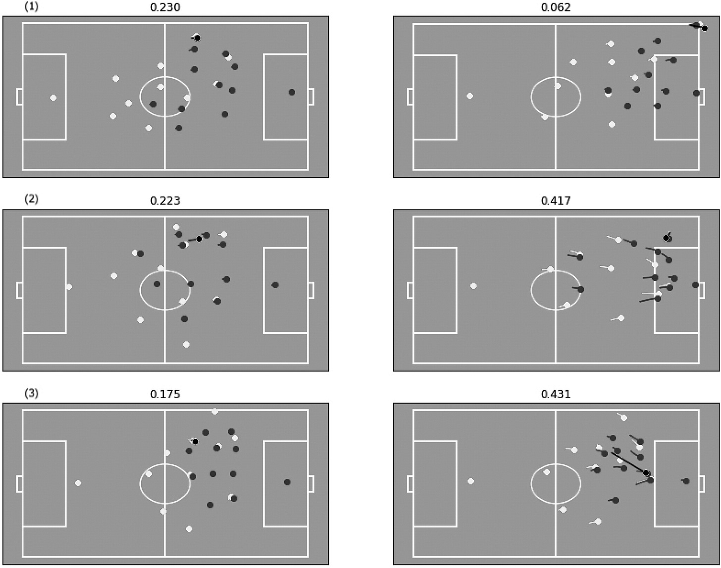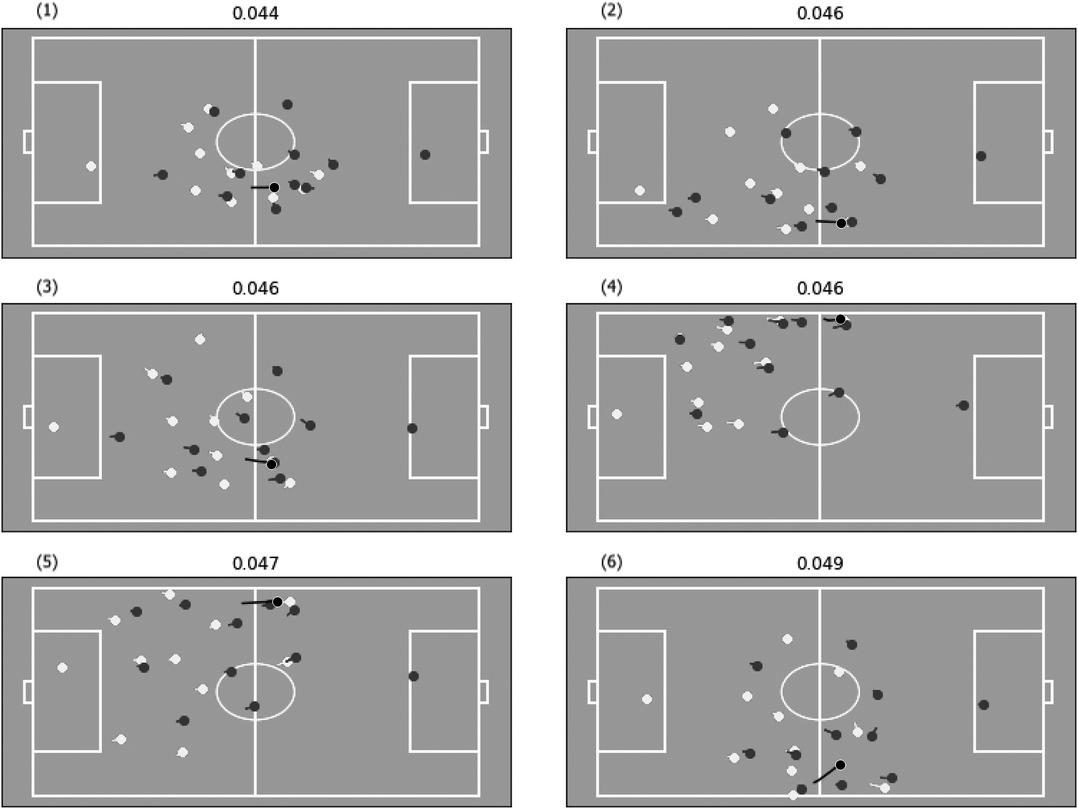 Low-valued scenes (Fig. 6) showed tight marking and limited passing lanes, often leading to immediate loss of possession.