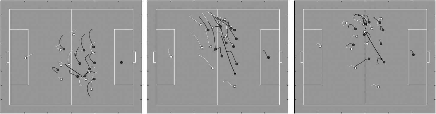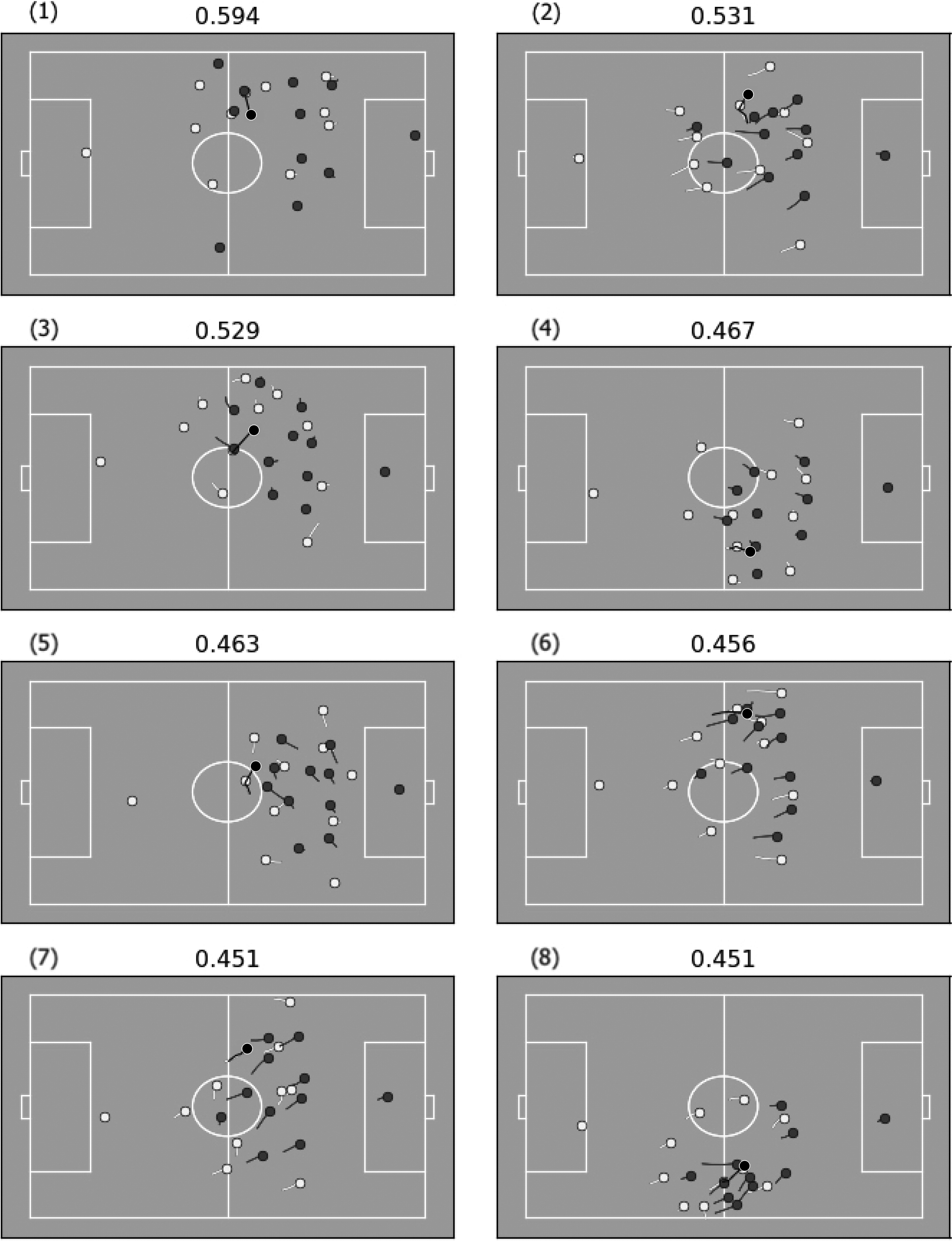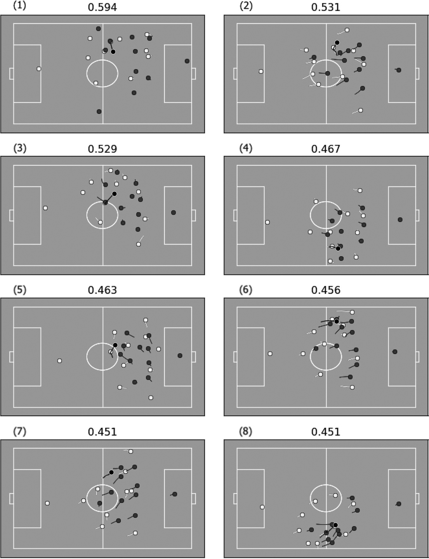 Low-valued scenes (Fig. 6) showed tight marking and limited passing lanes, often leading to immediate loss of possession.