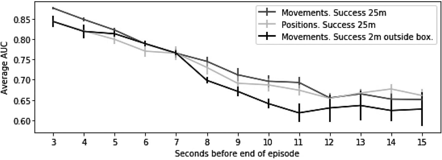 When scoring states between 3 and 15 seconds before possession ended, the AUC declined gradually with increasing temporal distance from the episode’s outcome (Fig. 3). Even at 13 seconds before the end, the AUC remained well above 0.5, indicating that the model captured meaningful spatiotemporal patterns rather than random fluctuations. Both success definitions yielded comparable performance, with slightly higher stability in the “25 m” scenario.