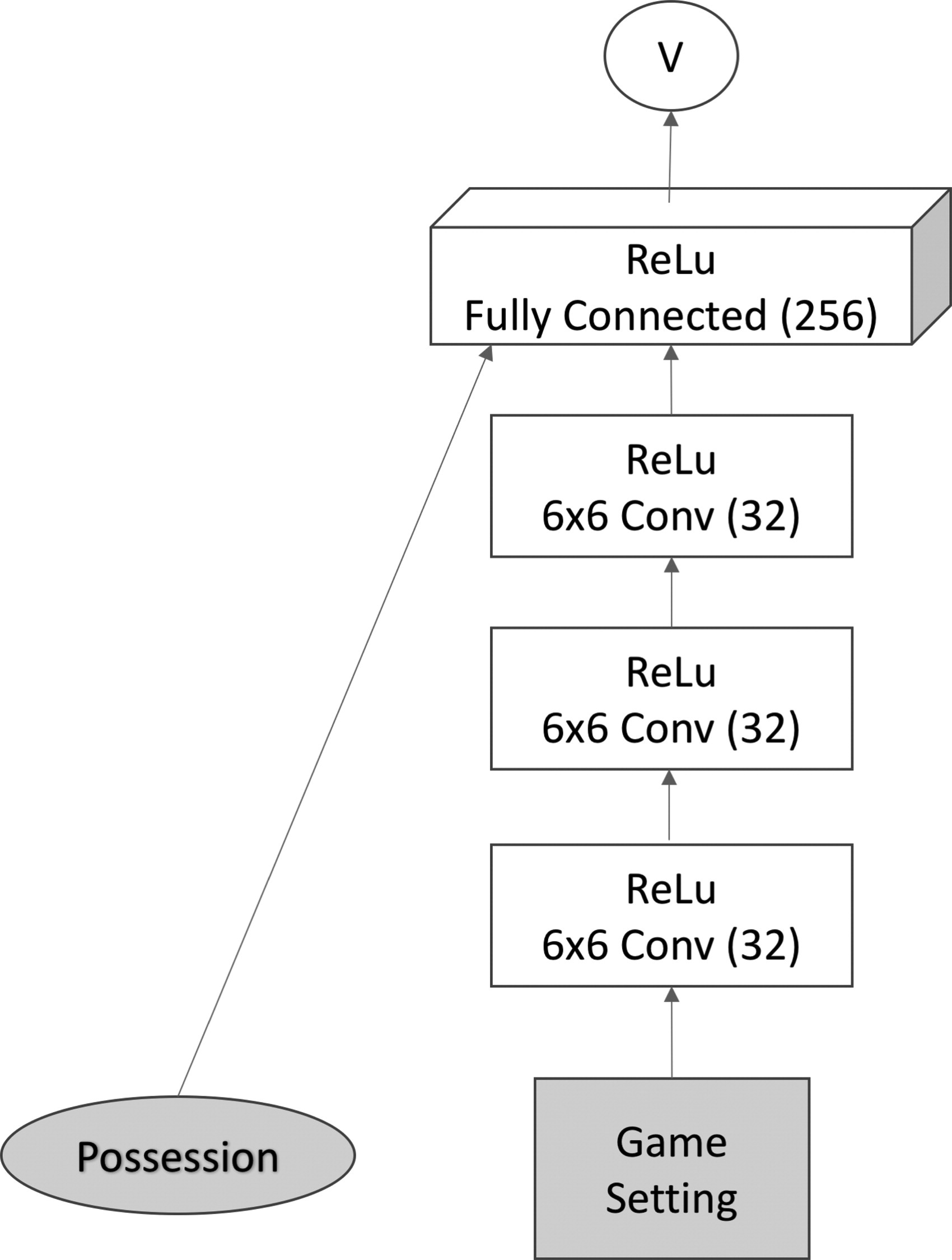 Game states are transformed into image-like tensors with nine channels; representing player and ball positions, partial velocities, and possession indicator (+1 or −1). A three-layer convolutional neural network (CNN) with 32 kernels per layer (6×6 filters, ReLU activation) encodes spatial information, followed by a fully connected layer of 256 neurons producing the scalar value V(s). A reduced version excluding movement channels serves as a baseline to assess the effect of dynamic input.