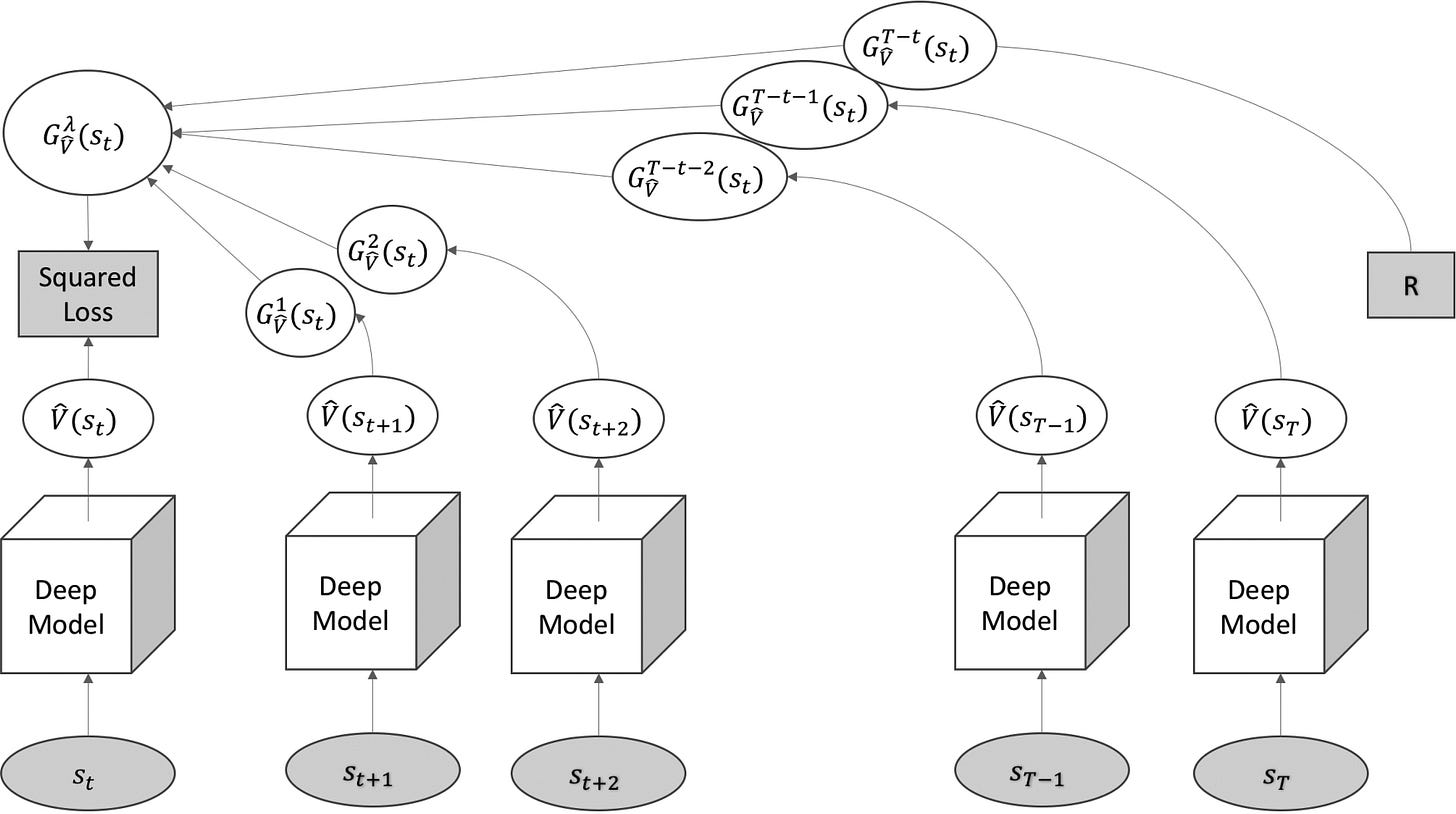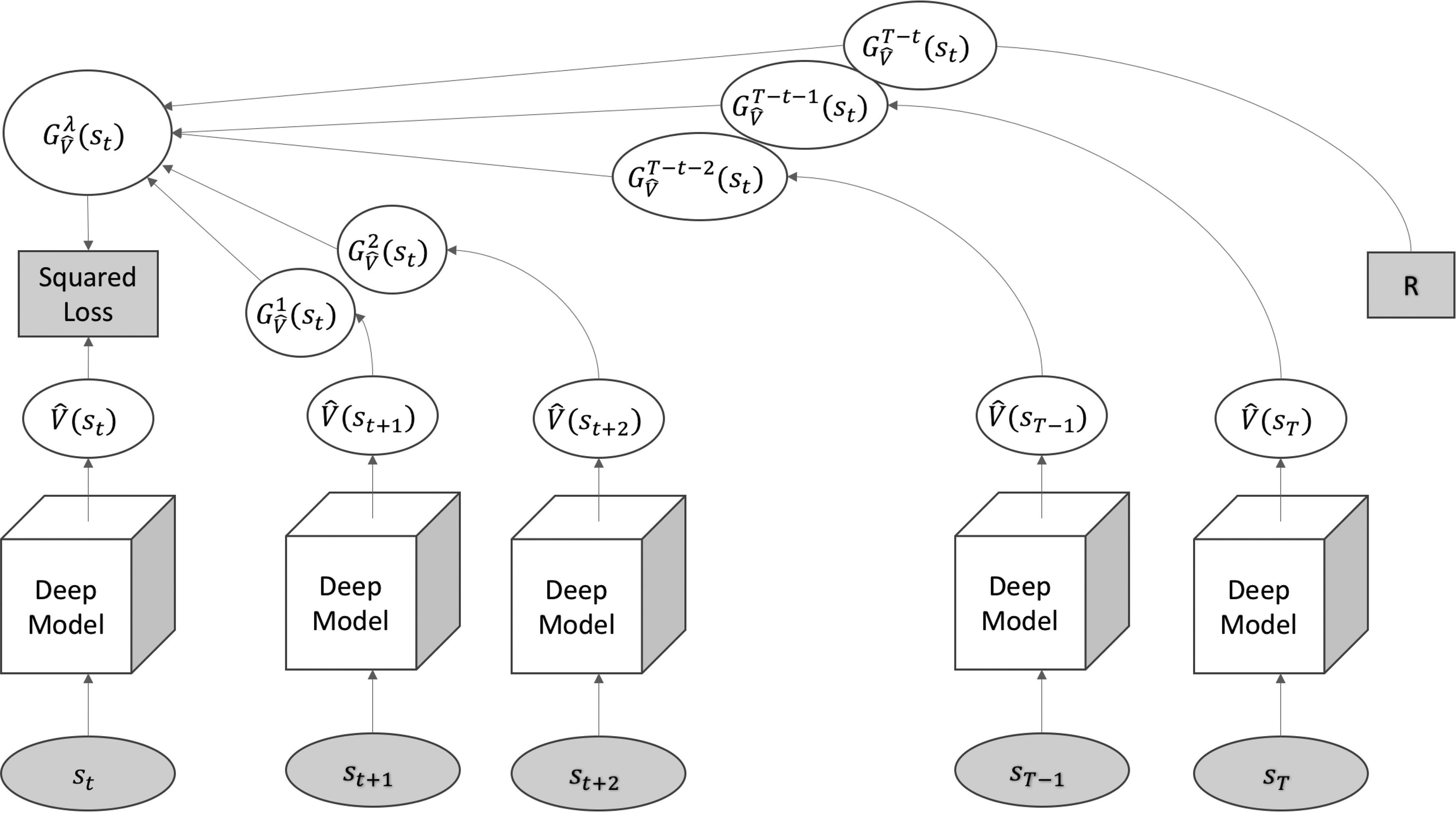 The authors employ the 𝜆-return algorithm [25], a forward-view variant of TD(λ) [19], to estimate values from fixed episodes. For each sample episode e=(s_1,...,s_T), the n-step return is: