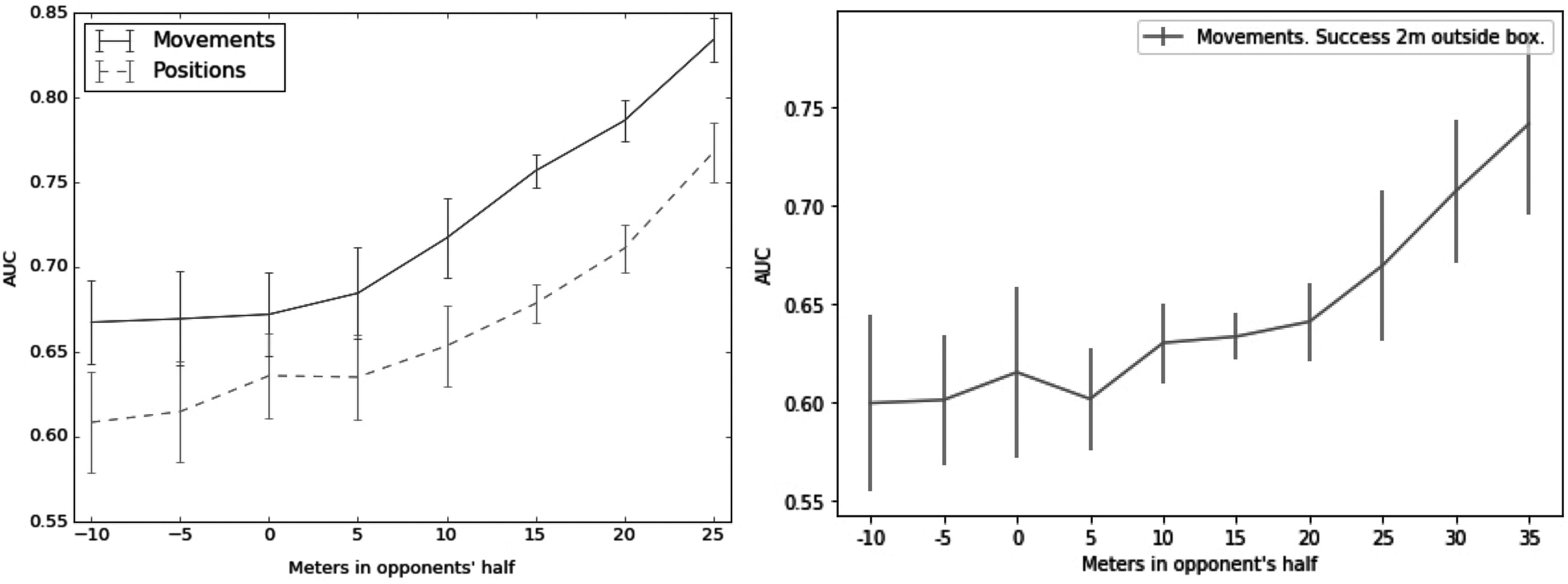AUCs were also computed for specific pitch zones (Fig. 4). The model performed best when the ball was closer to goal, confirming that valuations reflected attacking potential. Models including movement information consistently outperformed static positional ones, especially in advanced zones, suggesting the importance of velocity data for anticipating success. In contrast, a simple distance-to-goal baseline achieved an AUC of only 0.5, far below the learned model.