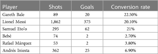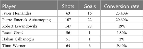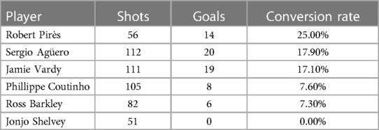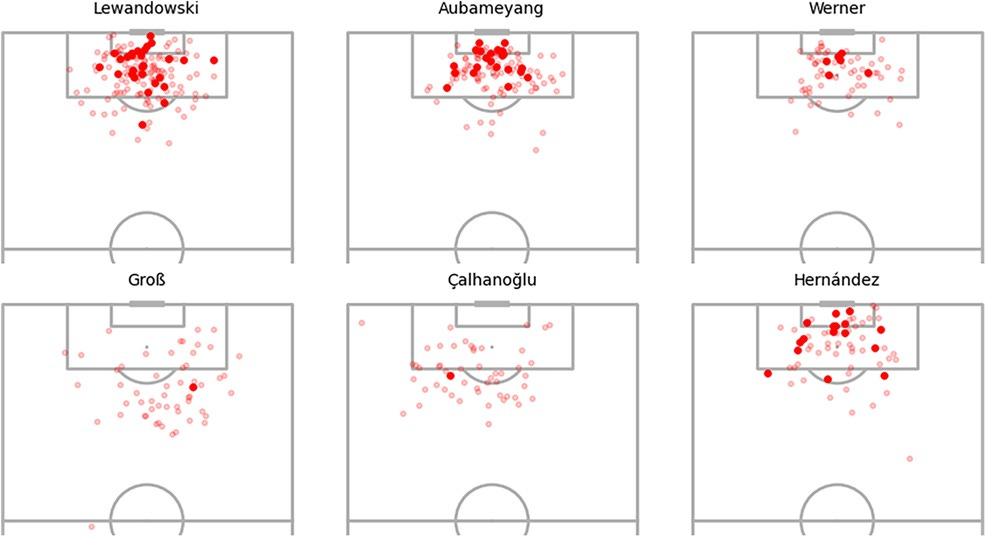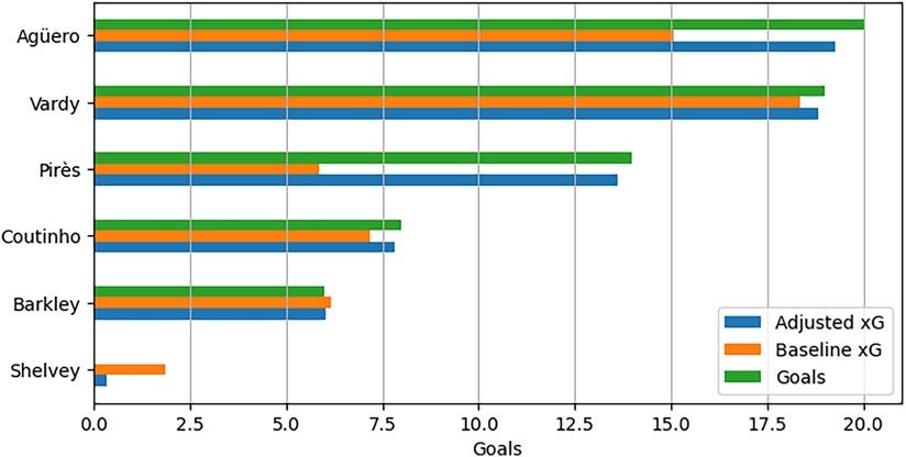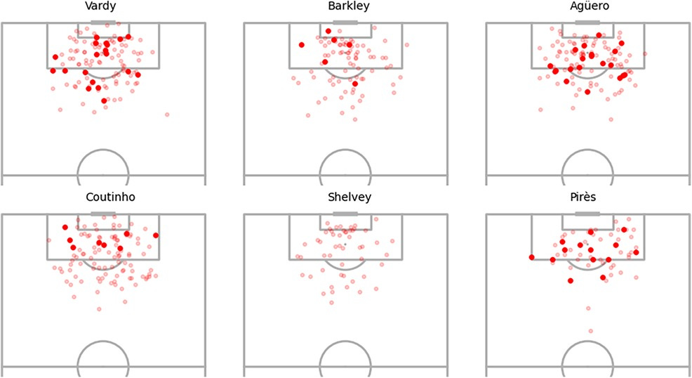 Visualization of shot maps supports these findings: high-adjustment players (e.g., Pirès, Agüero) consistently score from difficult positions, while low-adjustment players (e.g., Shelvey) fail to convert central, high-xG opportunities.