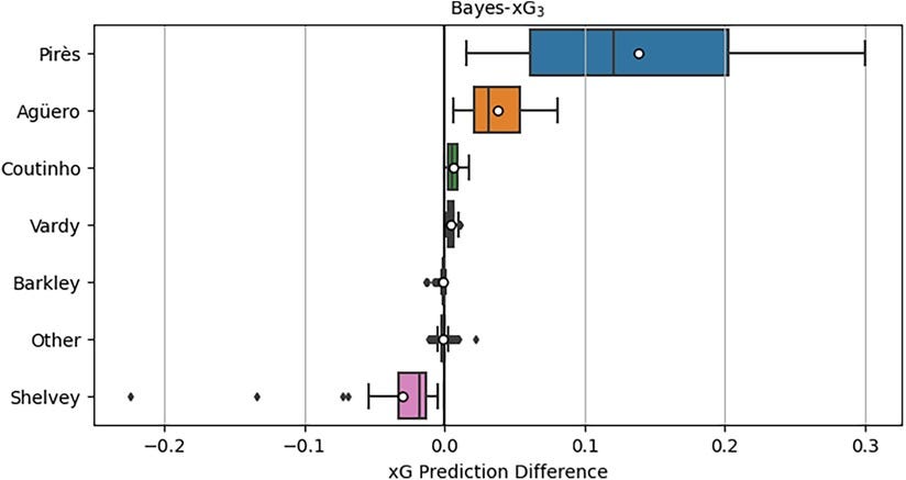 The third experiment extends hierarchical Bayesian modeling to player-level adjustments. The Bayes-xG3 model groups data by individual players rather than positions, allowing for player-specific corrections. Due to computational constraints, only a subset of players is analyzed, selected based on conversion rates. High-performing goal scorers (e.g., R. Pirès, S. Agüero, J. Vardy) are expected to receive positive xG corrections, while inefficient shooters (e.g., J. Shelvey) should receive negative adjustments.