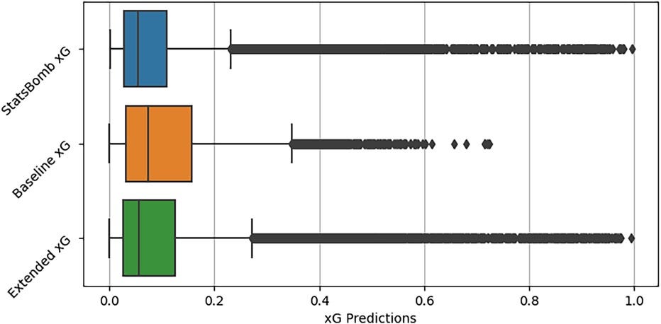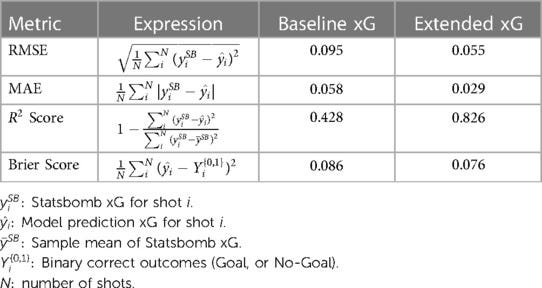 Model performance is assessed using R², mean absolute error (MAE), and root mean square error (RMSE). The Extended model significantly outperforms the Baseline model, achieving a Brier score close to StatsBomb’s 0.075, indicating near-parity with an industry-leading xG model.
