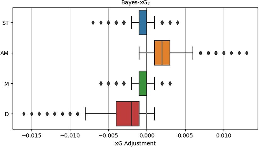 Positional adjustments to xG using Bayesian hierarchical modeling.