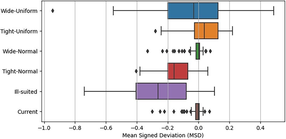 Mean signed deviation (MSD) analysis quantifies the deviation of each prior’s predictions from the non-Bayesian extended model. Wide normal priors exhibit the smallest MSD values, while tight normal and ill-suited priors show strong over- or under-prediction tendencies. These results highlight the importance of selecting well-informed priors that balance informativeness with flexibility.