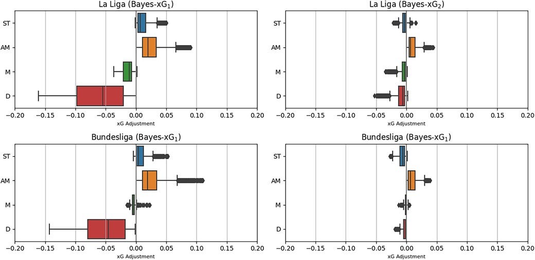 To generalize findings beyond the English Premier League, the Bayesian hierarchical models are applied to La Liga(19,000 shots) and Bundesliga (7,500 shots). Results confirm the consistency of positional effects across leagues: defenders exhibit negative xG corrections, attacking midfielders receive positive adjustments, and positional adjustments shrink in the extended model (Bayes-xG2).