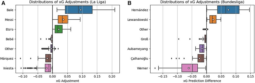 Player-specific corrections in Bayes-xG3 are validated using high- and low-conversion players from La Liga (e.g., G. Bale, L. Messi) and Bundesliga (e.g., P. Aubameyang, H. Çalhanoğlu). As expected, Messi and Bale receive strong positive xG corrections, while underperforming shooters receive negative adjustments. Notably, Aubameyang, despite a high conversion rate, exhibits negative adjustments, indicating that his goals come primarily from high-xG chances.