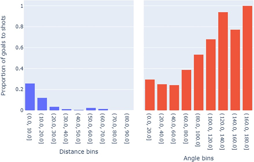 Shot Angle: Computed using the cosine rule to determine the angle between the shooter and goalposts.