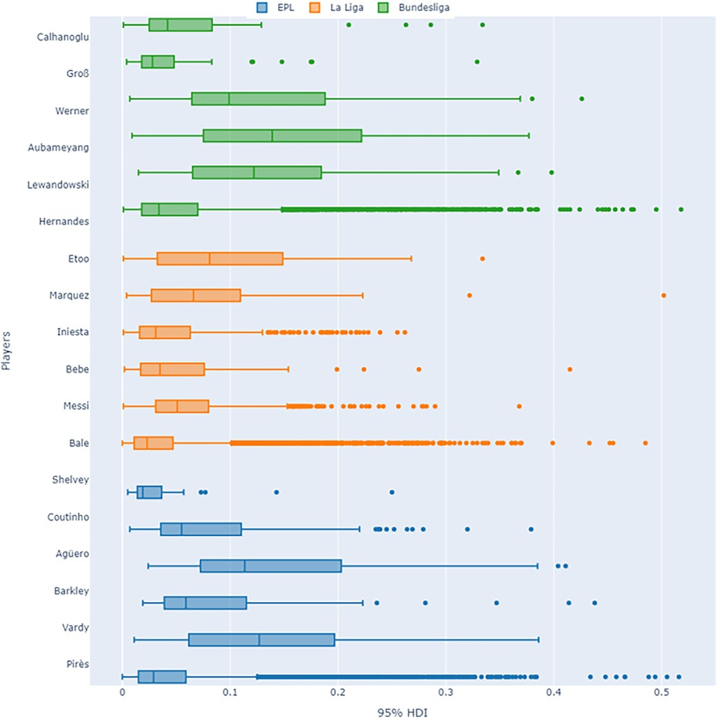 A similar analysis for Bayes-xG3 reveals that high-adjustment players (e.g., Pirès, Bale) exhibit significantly wider HDI values than average players, indicating greater variability in their shot probabilities. The model’s ability to capture player-specific uncertainty is particularly valuable for scouting and player evaluation, allowing for a probabilistic assessment of finishing ability.