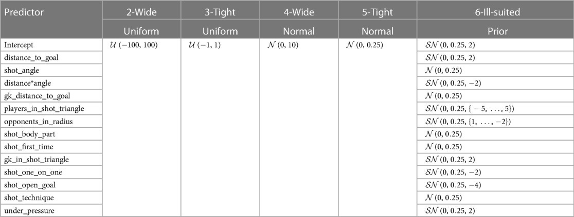 Comparisons reveal that wide uniform priors produce erratic xG estimates, while tight normal priors systematically underestimate goal probabilities. The best performance is achieved with wide normal priors, which closely match the benchmark model.